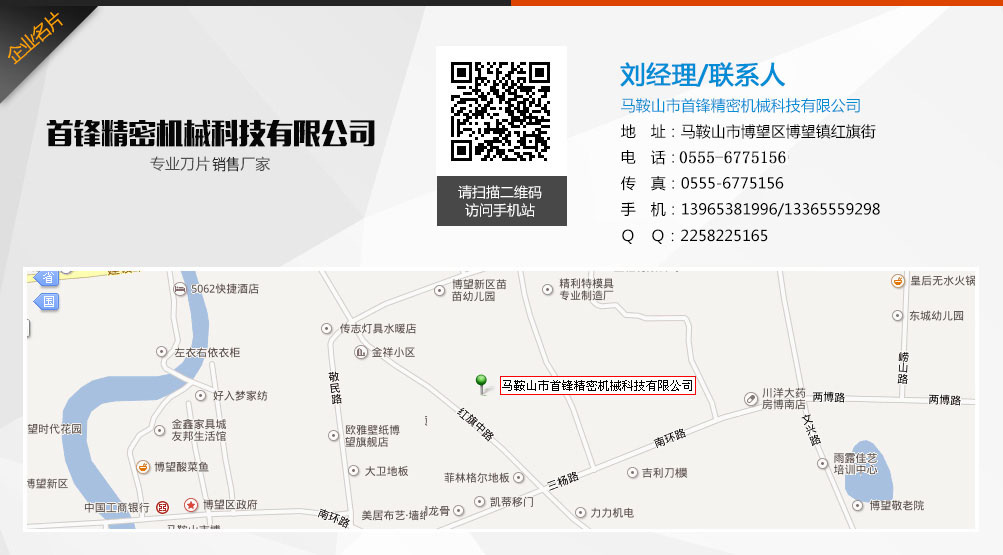 馬鞍山市首鋒精密機械科技有限公司位于中國之鄉馬鞍山市博望區博望鎮紅旗街。地理環境優越,交通便利。工業區內314省道貫穿,連接江、浙、滬、皖,距南京祿口國際機場30公里。   我們專業研發銷售各種機械圓刀、長刀、分切刀片、沖剪刀、剪板機刀片、等沖壓剪切刀具機械配件。產品廣泛應用于冶金、造紙、紙品加工、印刷、橡膠工業、塑料、木材加工、食品、金屬加工、皮革、無紡布、不干膠、膠帶、板材加工、軋鋼、紡織、五金機械等行業。   馬鞍山市首鋒精密機械科技有限公司,機械刀片加工歷史悠久,具有豐富的切削刀具加工經驗,擁有多條國內先進的研發設備和一套科學加工工藝,在保證了產品質量和品質的同時,使產品生產做到了程序化和規?;?。   我們本著“誠信、求精、高效”的精神,期待著與國內外各界開展更為廣泛的交流與合作!